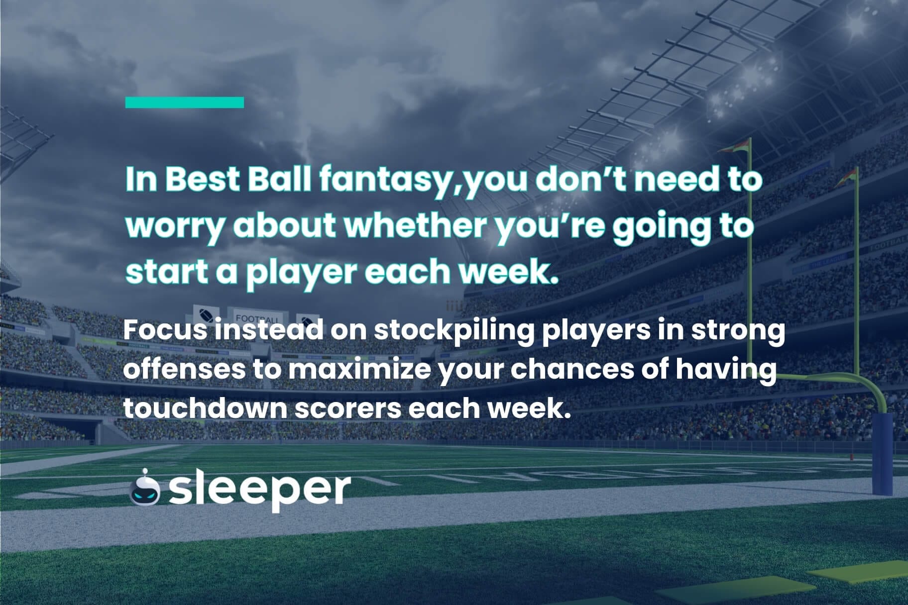 - Focus on stockpiling players in strong offenses to maximize your chances of touchdown scorers each week, especially late in the draft. Remember, you don’t need to worry about whether you’re going to start a player each week.