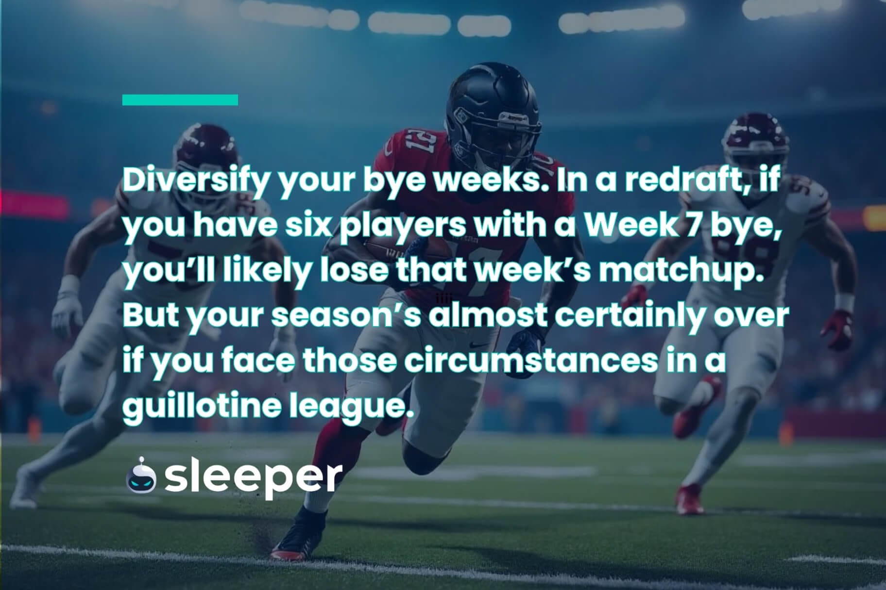 - Make sure you diversify your bye weeks. In traditional redraft, if you have six players with a Week 7 bye, you’ll likely lose that week’s matchup; you at least have a margin for error. Your season’s almost certainly over if you’re in a guillotine league with a team under those same circumstances.