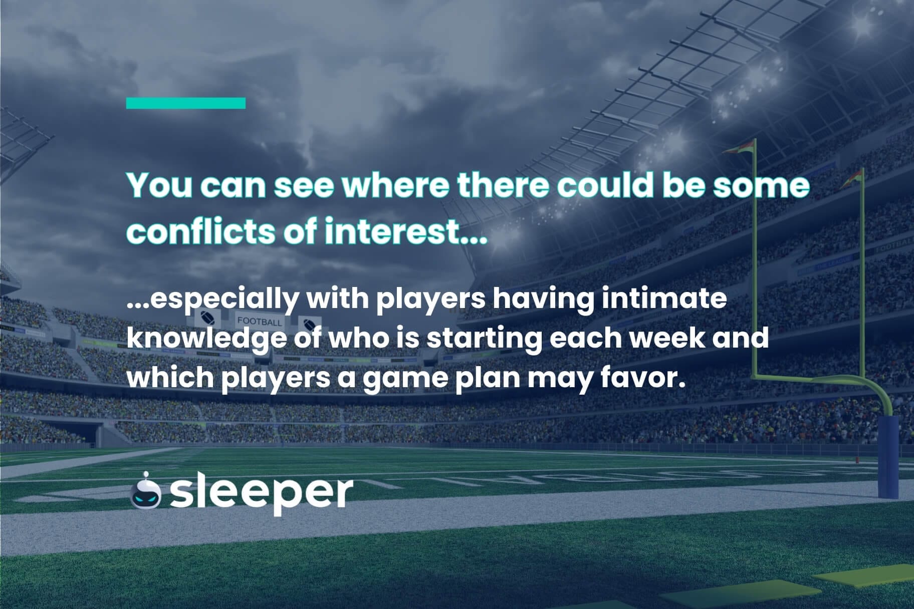There could be conflicts of interest, especially with players having insider knowledge of who is starting each week and which players a game plan may favor. There’s also the matter of players actually controlling the outcome of every play. That’s not to say a QB wouldn’t target an open receiver because it could cost him his fantasy week, but in theory that is part of the range of outcomes.