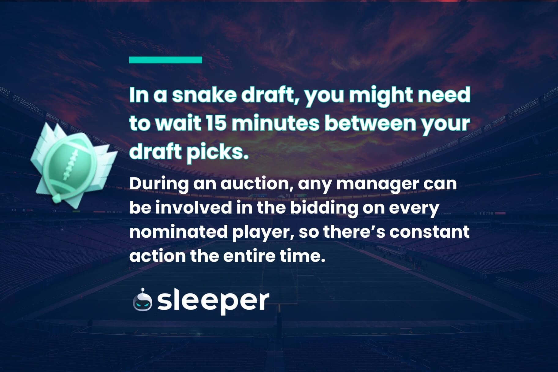 Auction drafts also allow for a more engaging and interactive experience. In a snake draft, you might need to wait 10 to 15 minutes between your draft picks. During an auction, any manager can be involved in the bidding on every nominated player, so there’s constant action the entire time.