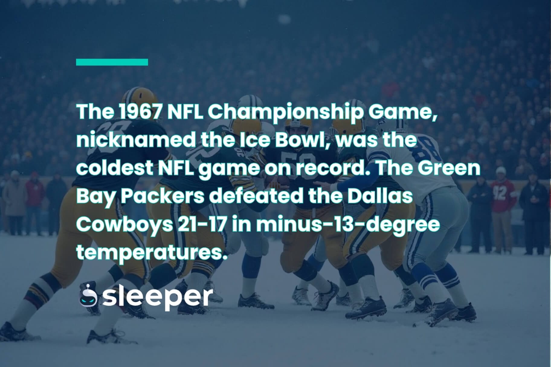 As mentioned above, the Ice Bowl was the coldest game in NFL playoff history. Not only did it feature the lowest recorded on-field temperature, but it was also one hell of a football game, touted among the best in the history of the NFL during the league's 100th anniversary celebration. With Bart Starr sneaking in for a game-winning touchdown in the final seconds, the Packers earned a frosty victory that left the Cowboys literally out in the cold.