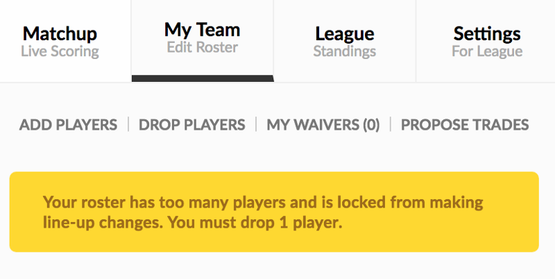 If you had more picks than other teams and ended up over the roster limit, you will need to cut down to the roster limit specified in your league settings before you can pick up players on Free Agency or Waivers.