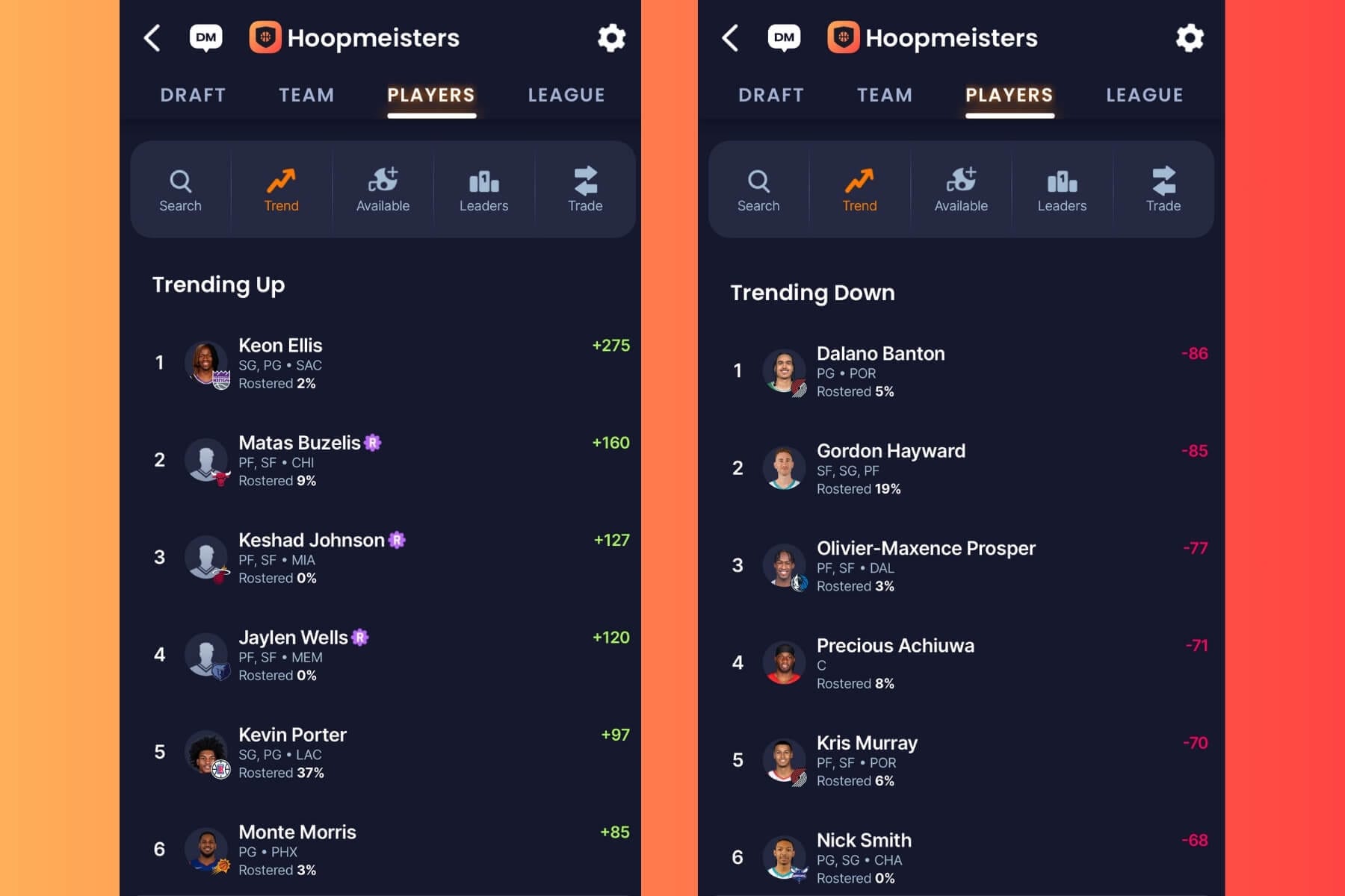 It can be tough to identify which players to add from the waiver wire and who you should cut, but that’s where Sleeper’s trending players tab helps. Each week, the Sleeper app shows you which players have been added and dropped the most by the platform’s fantasy managers. This helps you spot potential breakouts, while also helping you feel better about cutting certain players.