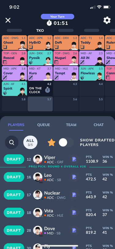 Similar to other fantasy sports, you start by inviting your friends into a league, collectively deciding on a time to hold your draft, and then each drafting a roster of players to fill your respective fantasy teams. The ideal league size is 6-8 people, and each team will have 5 players on their roster at the end of the draft.
