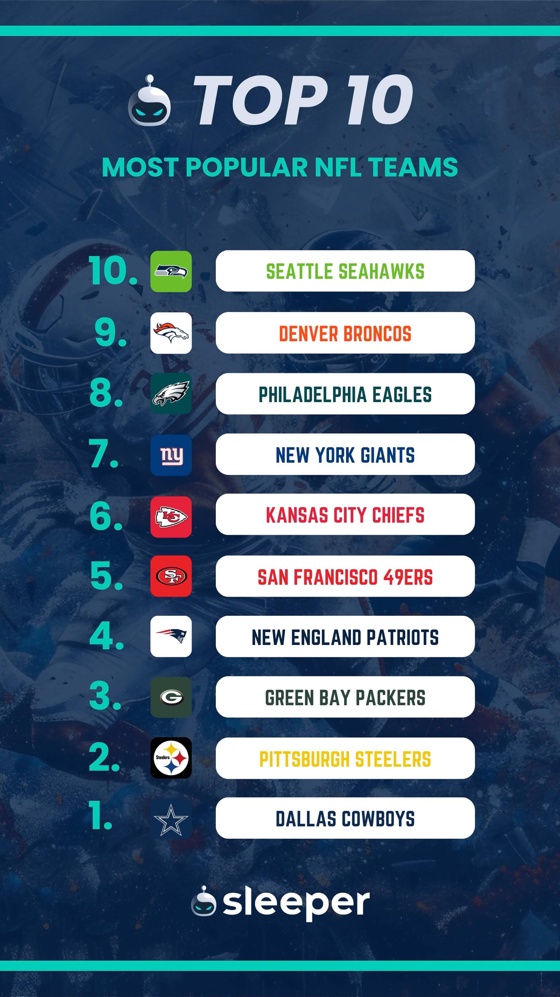 Whether you’re a new fan seeking info to decide which team you want to root for or a more time-tested fan and fantasy football manager who is curious how team popularity could impact how certain players are viewed — or maybe you just want to be ready for Trivia Night — read along as we go behind The Shield and delve into the NFL’s most popular franchises.