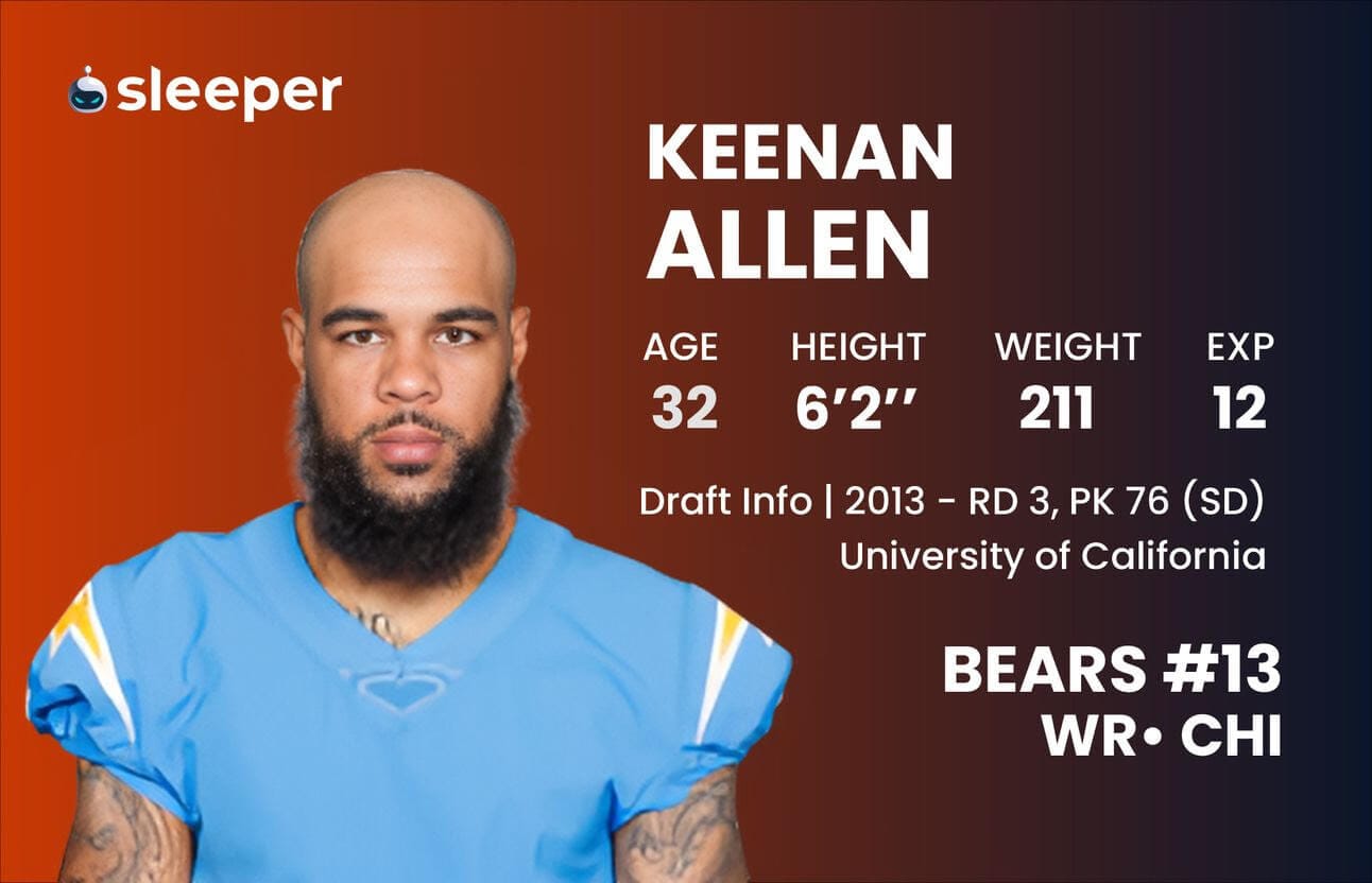 Allen led the NFL with 8.3 receptions per game in 2023, racking up 1,243 yards in the process. The 32-year-old was then traded to Chicago in exchange for a 2024 fourth-round pick. With increased target competition and a likely quarterback downgrade from Justin Herbert, Sleeper conservatively projects 84 receptions and 933 receiving yards, with the younger D.J. Moore estimated at 1,034 receiving yards to lead the team. Even rookie Rome Odunze is projected for more receiving yards (961) than Allen.