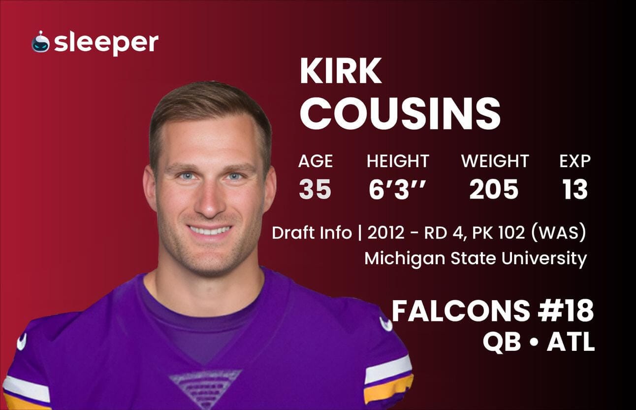 Cousins is tied to Atlanta for at least three years, with $100 million guaranteed (he inked a four-year, $180 million contract). For fantasy purposes, Cousins’ arrival should boost the value of the Falcons’ top skill players – RB Bijan Robinson, WR Drake London and TE Kyle Pitts – more than his own stock.