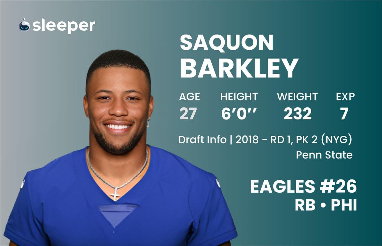 Barkley was the biggest domino to fall in the RB market, signing a three-year, $37.75 million deal. Sleeper projects 261 carries, 44 receptions, 1,468 total yards and nine touchdowns, which helps justify his RB6 half-PPR price tag (second-round ADP of 14). Christian McCaffrey and Breece Hall are the only other backs that Sleeper expects to get more than 300 touches in 2024.
