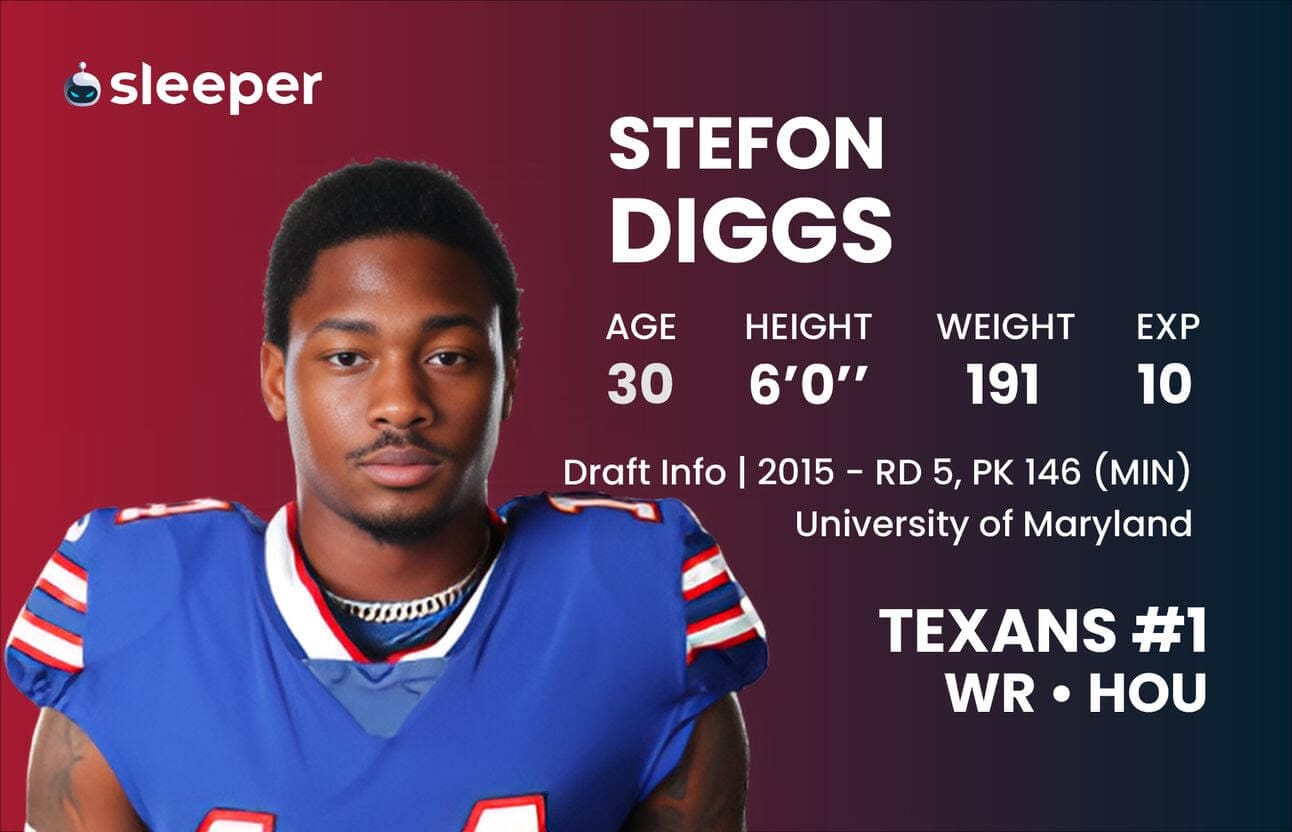 Buffalo shipped the frustrated Diggs to Houston in exchange for a 2025 second-round pick. He may have been unhappy with his previous role, but it’s hard to see him reeling in more than last year’s 107 receptions now that he’s competing with Nico Collins and Tank Dell for targets.