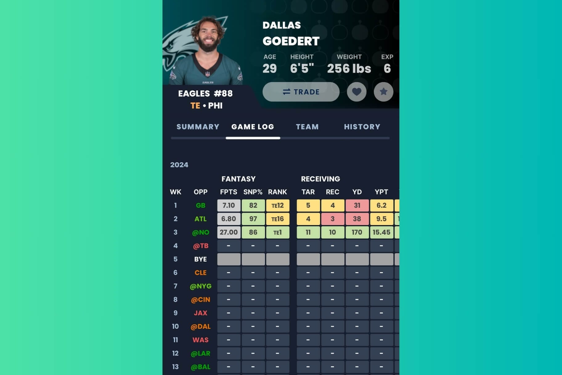 Instead, it’s Philadelphia’s pass-catching TE, who has stepped up following the injury to A.J. Brown by posting a position-best 40.9 PPR points. The seventh-year pro owns the second-highest target share in the Eagles’ offense (21.3%), thanks in large part to his 10-catch, 170-yard Week 3 explosion.