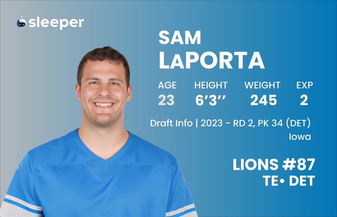 Even more worrisome, this projection is less than one fantasy point per game above Mark Andrews, McBride and George Kittle. Snagging LaPorta as TE1 off the board in the second round is unlikely to give you a major positional advantage in fantasy football.