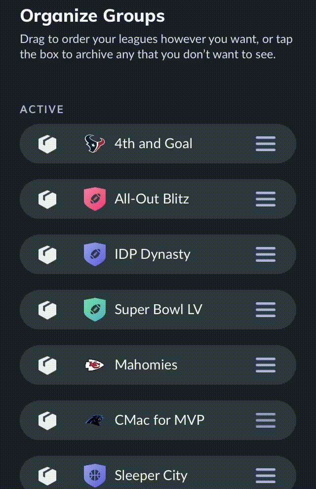 Now, you can organize your leagues and put them in the order you'd like. We also added the ability to archive any current or past league so that it is hidden from your view.