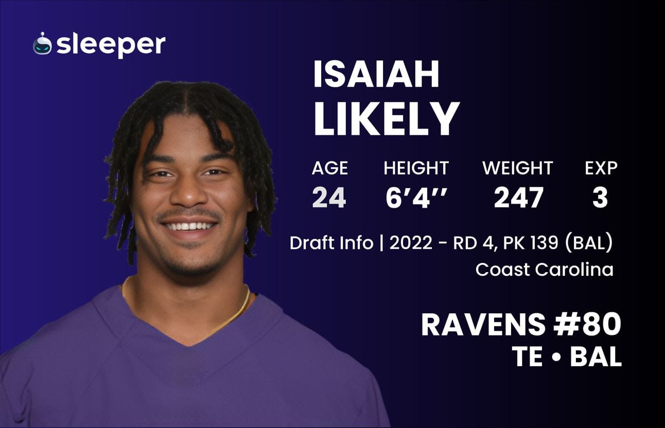 - Isaiah Likely, Ravens (ADP 181.0, TE20)