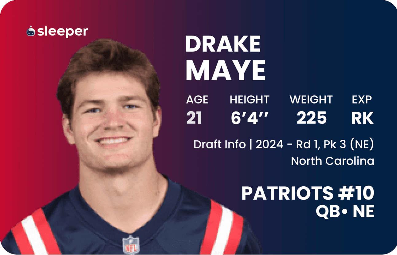 This year, Maye should be largely off your fantasy radar in redraft. There’s a slight chance for rushing volume, but Sleeper’s 271-yard projection doesn’t leave much room for optimism. If Maye can survive his rookie year, the future outlook is much rosier. It’s rare to get a quarterback of Maye’s talent around the eighth pick in superflex rookie drafts. There is recent precedent for Maye to outperform expectations in 2024 too. While he carries obvious risk this season, we just saw Stroud rise above a rough Houston situation – at least as it looked on paper before the 2023 season began – and put up a historic rookie season.