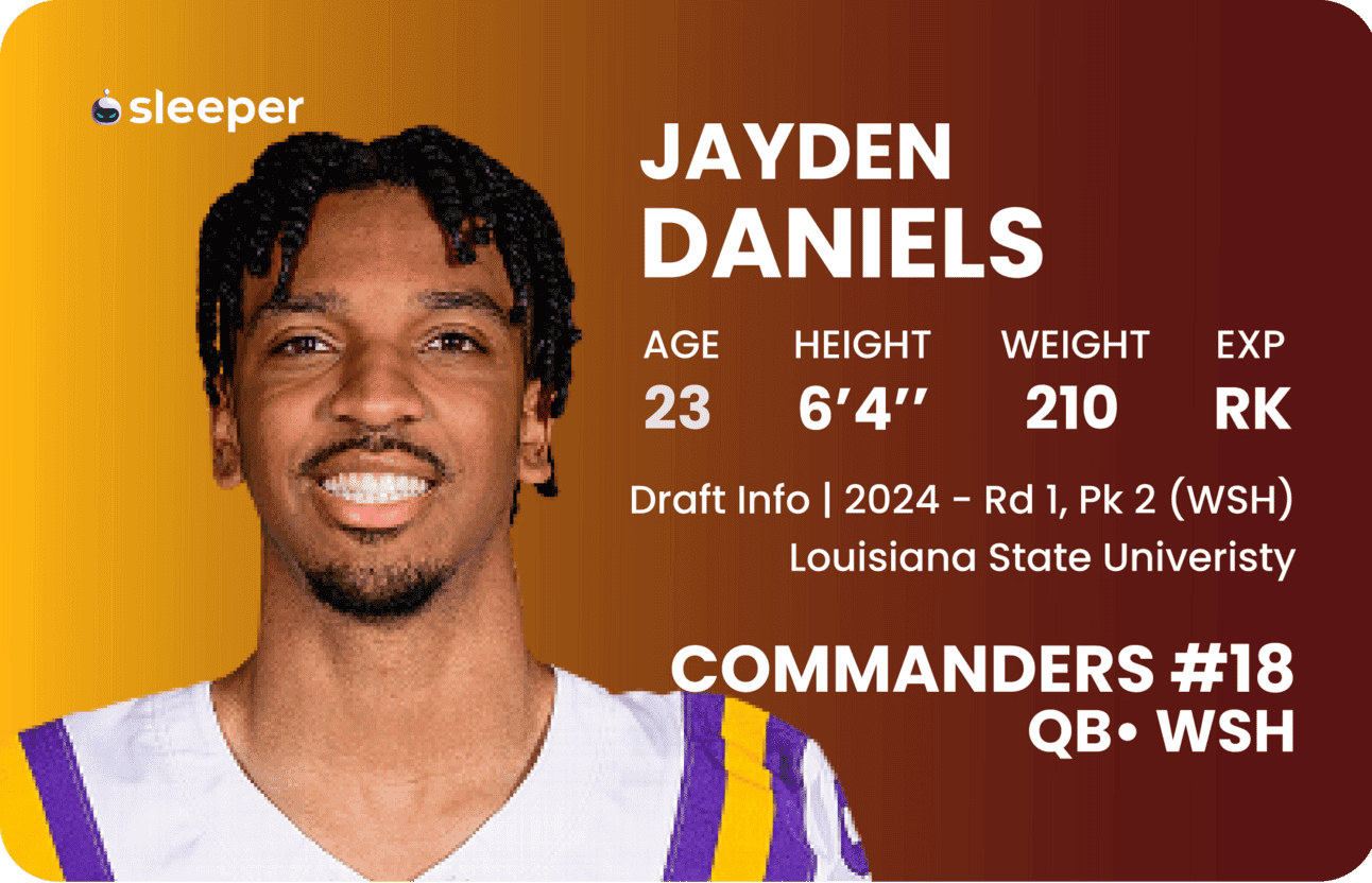 Washington’s offensive line is a bottom-tier unit, so Daniels will likely use his legs frequently. Sleeper projects Daniels to rush for more than 500 yards this season, though his upside is closer to 1,000. That would help fortify his floor, at the very least. Washington’s dearth of explosive options at the skill positions explains Daniels’ conservative 19-14 TD-INT ratio Sleeper passing projection. Like Williams, Daniels is the perfect QB2 for redraft (ADP 115 on Sleeper). In rookie drafts, Daniels will usually go at the end of the first round in 1-QB formats, though he’s a top-four pick in superflex/2-QB.