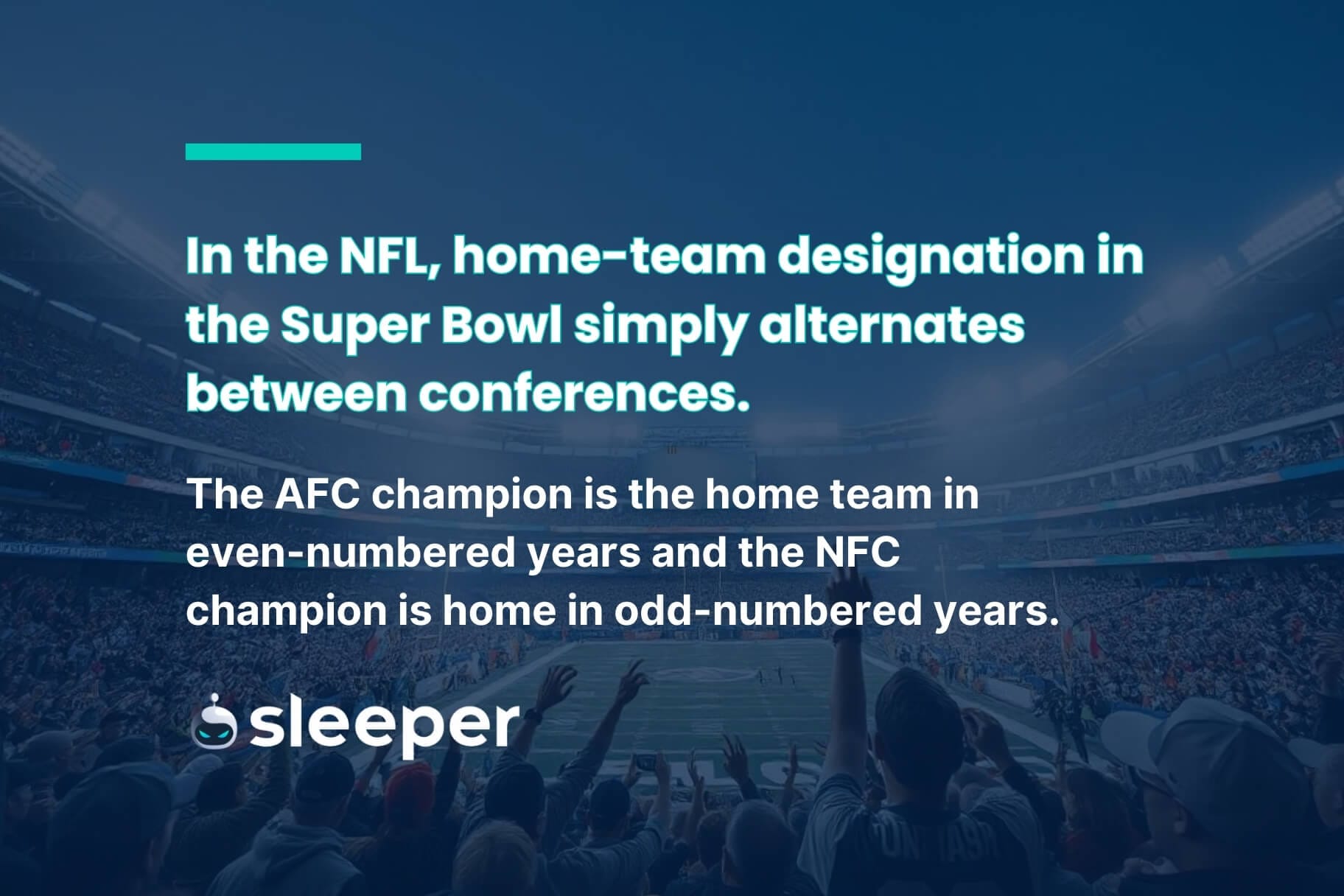 The answer is easier than it is in other sports, where home-field (or home-court) advantage is usually awarded to the team with the better record — or, during the infamous period in MLB when home-field advantage in the World Series was determined by the outcome of the All-Star Game. In the Super Bowl, home-team designation alternates each year between conferences, with the AFC champion being named the home team in even-numbered years and the NFC champion being named the home team in odd-numbered years.