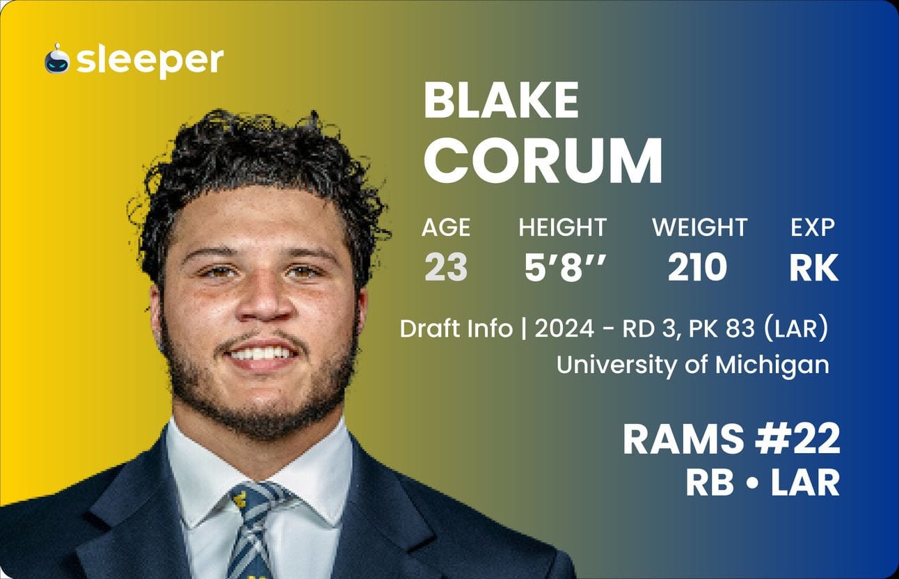 Blake Corum: Corum (ADP 120.1) would benefit from an injury to Kyren Williams, as the rookie would immediately receive 20 touches per game. Additionally, the Rams having spent third-round draft capital on Corum hints at potential role fragility for Williams.