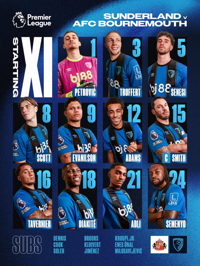Bournemouth Starting XI vs Sunderland! 👀🍒 Amine Adli makes his first Premier League start for the club, while Semenyo and Smith return to the starting XI. 🇲🇦🙌