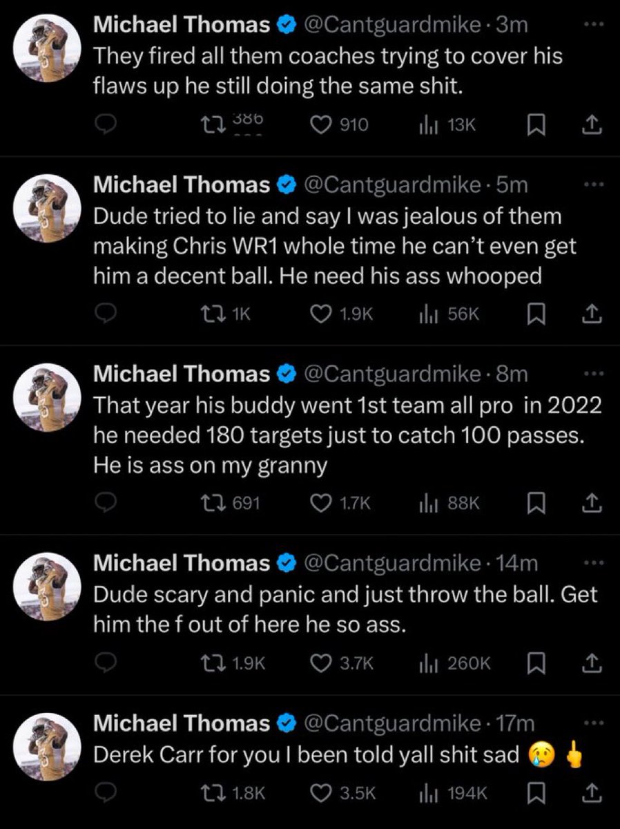 Michael Thomas is on Twitter/X UNLOADING on Derek Carr 😬