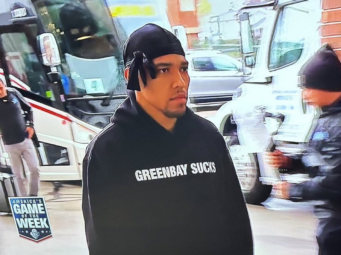 Lions WR Amon-Ra St. Brown is wearing a “GREEN BAY SUCKS” sweatshirt 💀