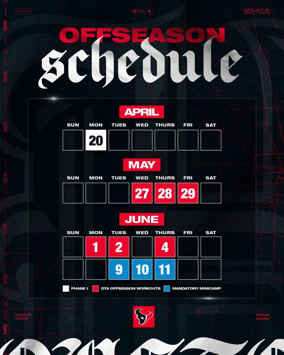 Relevant days for Houston’s offseason program: Phase 1 - April 20th OTA - May 27-29, June 1-2 & 4. Mandatory Minicamp - June 9-11