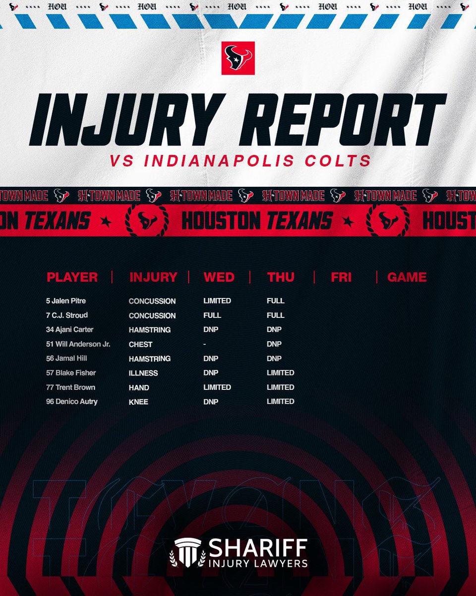 Texans Thursday Injury Report for week 13 vs Colts: - C.J. Stroud & Jalen Pitre practice fully today who should be ready to go come Sunday. - Will Anderson Jr. did not practice with a chest injury. - Trent Brown & Blake Fisher were both limited.